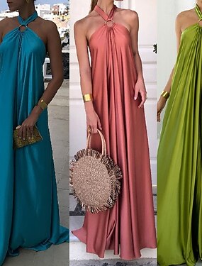 Per donna Abito Lungo Maxi Abito Abito in Raso Vestito Casual Abito Estivo Abito con Collo Allacciato Moda All'aperto Ferie Data Vestibilità regolare Semplice Senza Maniche All'americana Blu Verde