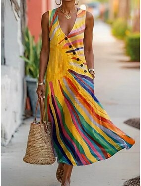 Per donna Abito Midi Abito a Tubino Vestito Estivo Abito a trapezio Vacanza Casual Boho Spiaggia Feste Vestibilità comoda Grafico A righe Senza Maniche Girocollo Grigio Estate Primavera