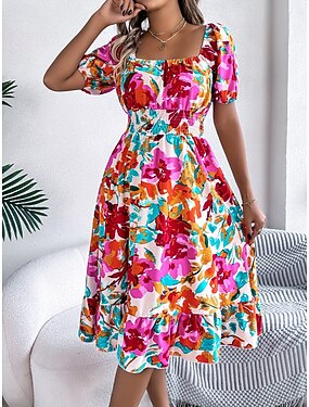 Per donna Abito Midi Abito a trapezio Vacanza Casual All'aperto Uscire Vestibilità regolare Floreale Grafico Manica Corta Collo quadrato Blu Rosso Verde Estate Primavera