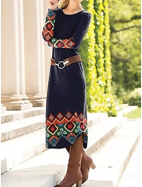 Abito Midi da Donna V Collo Maniche Lunghe Kaftan Leggero Comodo A Line Abito Casual Boho Uscita Grafica Geometrica Astratta Maniche Lunghe V Collo Rosso Blu Verde Autunno
