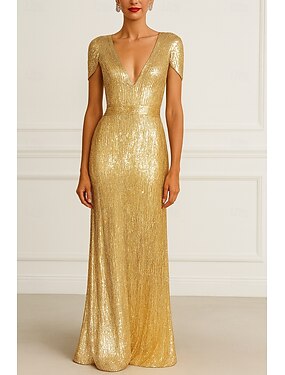 Tubino Colonna Lunghezza al pavimento Abiti da Ballo Abito da Sera Da principessa Abito formale Elegante Monocolore Scintillante Manica Corta Scollo a V Matrimonio Formale Abito Champagne per la