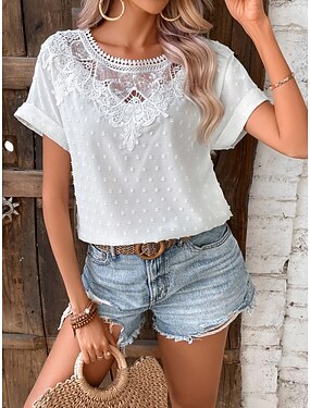 Per donna Blusa Pizzo Patchwork Tinta unica Elegante Casual Manica Corta Scollo a V Top Regolari Quotidiano Nero Bianco Estate Primavera