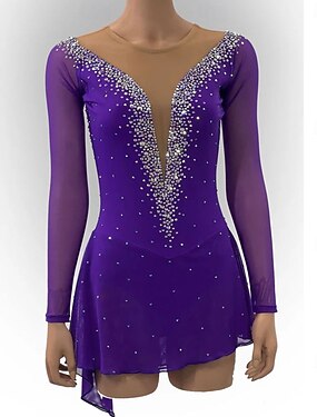 abito da pattinaggio artistico, abito da pattinaggio sul ghiaccio da donna e da ragazza, viola, schiena scoperta, orlo asimmetrico, maglia ad alta elasticità, abbigliamento da pattinaggio per