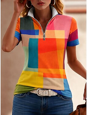 Per donna Maglietta Cerniera Zip a un quarto Grafico Geometrico Blocco di colori Tropicale Hawaiano Elegante Manica Corta Collo Alto Top Regolari Matrimonio in Spiaggia Quotidiano Sportivo Blu Rosa