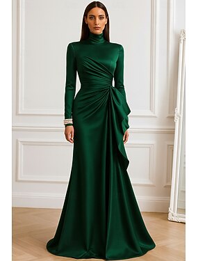 Tubino Colonna Lunghezza al pavimento Abito da Sera Da principessa Abito formale Elegante Setoso Manica Lunga Collo Alto Matrimonio Formale Tasca Raso con Pieghe Volant