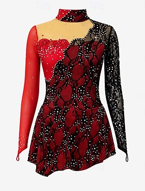 Abito da pattinaggio artistico Per donna Ragazze Pattinaggio sul ghiaccio Vestito Nero / Rosso Foro per il pollice Orlo asimmetrico Rete Spandex Pizzo Elasticizzato Allenamento Professionale