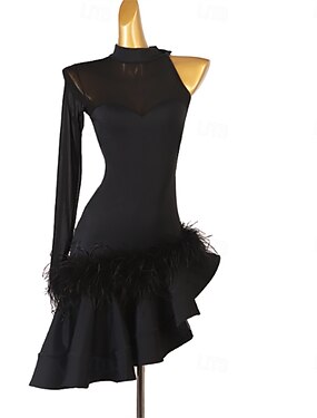 abiti da ballo latino-americani rumba con piume e spalle oblique neri da donna