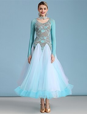 abito da ballo da sala da donna, elegante abito da competizione per valzer, tango, foxtrot, con ricami floreali, in rete a strati – blu navy &azzurro