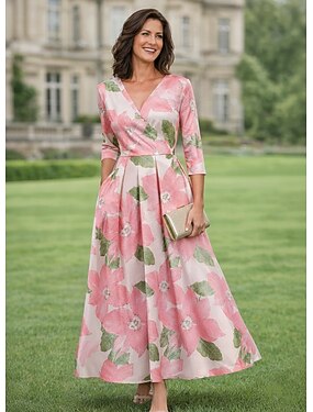 Linea ad A Lunghezza al pavimento Lunghezza Tè Abiti da Cocktail Elegante Vintage Floreale Manica Corta Scollo a V Festa in giardino Matrimonio Tasca Raso con Stampa floreale Pieghe Tasca