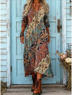 Per donna Abito Midi Abito Vintage Vestito Casual Vintage Vestibilità regolare Grafico Paisley Manica Lunga Scollo a V Rosso Estate Primavera