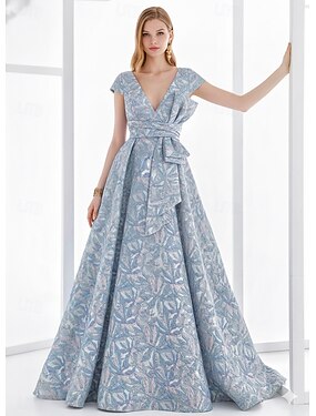 Linea ad A Lunghezza al pavimento Abito da Sera Da principessa Abito formale Elegante Floreale Spacco Alto Manica Corta Scollo a V Matrimonio Formale Tasca Jacquard Shiena scoperta con Stampa