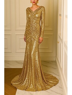Sirena Tromba Strascico a Terra Abiti da Ballo Abito da Sera Da principessa Abito formale Elegante Scintillante Stile Celebrità Manica Lunga Scollo a V Festa in giardino Matrimonio Raso Con Paillettes