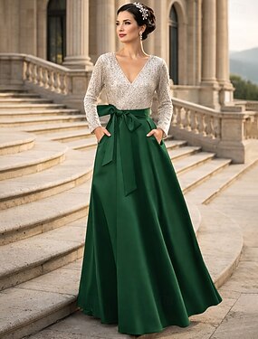 Linea ad A Lunghezza al pavimento Abito da invitata a nozze Abito Formale Abito svasato Abito da cerimonia per signora Manica Lunga Scollo a V Elegante Matrimonio Formale Ospite di nozze Raso con