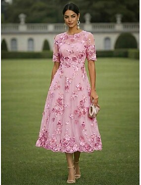 Tubino Colonna Lunghezza Tè Vestito da Festa Abito da Cocktail Abito da invitata a nozze Abito da cerimonia per signora Manica 3/4 Scollo Tondo Festa Dolce Ospite di nozze Semi-Formale Chiffon Pizzo