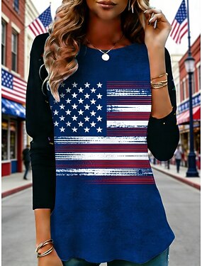 Per donna Maglietta Stampato Grafico Bandiera Americana Moda Elegante Classico Manica Lunga Girocollo Top Regolari Quotidiano Weekend Abbigliamento da vacanza Blu Primavera Autunno