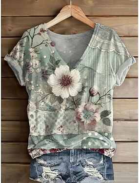 Per donna Maglietta Stampato Floreale Grafico Bohemien Vintage Casual Manica Corta Scollo a V Top Regolari Quotidiano Verde Estate Primavera