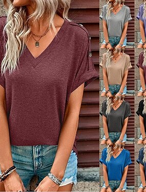Per donna Maglietta Bottoni Semplice Moda Elegante Classico Manica Corta Scollo a V Top Regolari Quotidiano Uscire Weekend Blu Nero Vino Blu marino Viola Estate Primavera