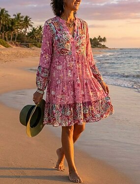 Per donna Abito maxi Abito a trapezio Vacanza Casual Boho Spiaggia Vestibilità regolare Floreale Grafico Paisley Manica Lunga Scollo a V Blu Rosa Rosso Verde Primavera Autunno