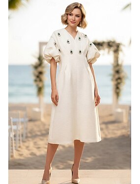 Linea ad A Lunghezza Tè Abito da invitata a nozze Abiti per invitati a matrimoni Quotidiano Manica Corta Scollo a V Festa in giardino Ospite di nozze con Pieghe Cristalli