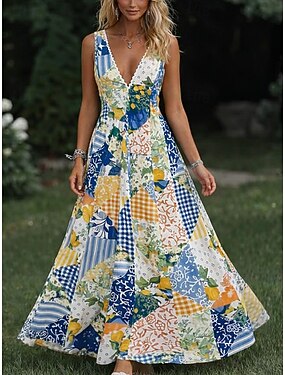 Abito maxi in lino sintetico da donna abito a linea vacanza casual all'aperto uscita vestibilità regolare floreale senza maniche scollo a V blu estate primavera