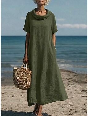 Abito lungo da donna in lino simile a cotone finto vestito estivo casual a vestibilità larga quotidiana semplice a maniche corte collo a rovescio blu rosa verde militare estate