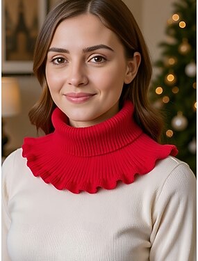 colletto natalizio in acrilico a coste da donna: comodo ed elegante con bordi arricciati, disponibile in più colori, perfetto per le vacanze invernali e le occasioni festive