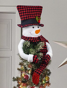adorabile pupazzo di neve come puntale per l'albero - cappello a quadri &sciarpa con rami di pino verdi, adatta per decorazioni natalizie, di Halloween e dell'albero del Ringraziamento - centrotavola