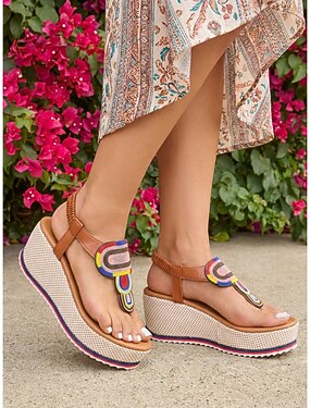 sandali con plateau e perline in stile bohémien da donna - espadrillas con zeppa e infradito marroni con ricami tribali colorati per resort all'aperto, vacanze al mare &fughe estive