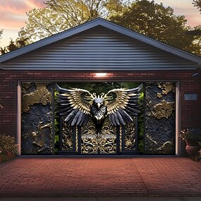 maestosa aquila nera oro ornata cancello dorato porta del garage stendardo ali spiegate architettura gotica lusso marmo texture effetto 3d esterno casa esterno murale decorazione palazzo simbolo di