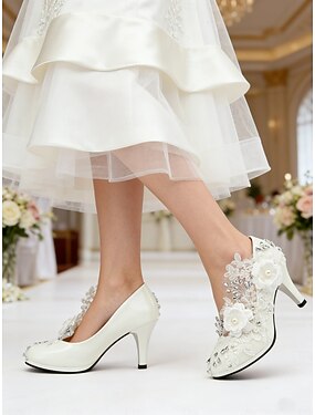 tacchi da sposa in pizzo con strass e applicazioni floreali 3D: eleganti décolleté da sposa a metà altezza per la sposa