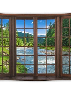 Arazzo da parete con finta finestra, vista panoramica sul fiume e sulle montagne, paesaggio naturale, perfetto per l'arredamento della casa e per il relax.