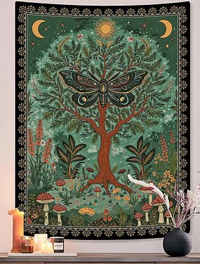 Arazzo vintage con falena, albero della vita, fungo, arazzo da parete, verde foresta, arte mistica celeste per camera da letto, soggiorno, arredamento per la casa