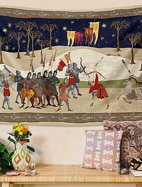 Arazzo da parete vintage gotico con arcieri medievali, scena di caccia, soldati con bandiere, cielo notturno stellato, arte araldica, decorazione murale per soggiorno, camera da letto, tana dell'uomo,