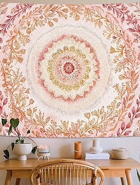 Arazzo da parete con mandala floreale rosa, motivo botanico arancione tenue, intricato motivo circolare, foglie, viticci, acquerello, decorazione da parete per camera da letto, soggiorno, dormitorio,