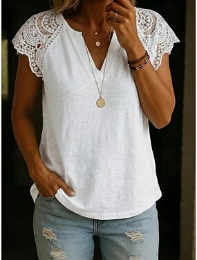 Maglietta da donna 100% cotone Patchwork Casual Giornaliero Weekend Solido Casual Simile al Lino Maniche Corte Collo A Girotondo Bianco Estate Primavera
