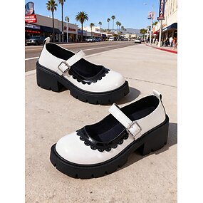 scarpe da donna Mary Jane bianche con plateau e dettagli smerlati neri – tacco spesso, calzature comode per uscite casual e per l'uso quotidiano