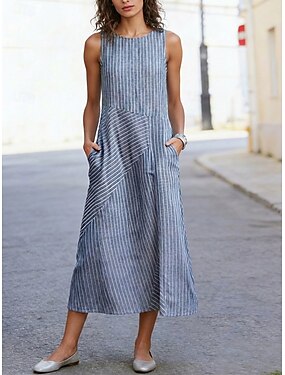 Per donna Abito Midi Vestito Casual Abito a righe Abito a trapezio Elegante Moda Quotidiano Vacanza Vestibilità regolare A righe Senza Maniche Girocollo Cachi Azzurro Estate Primavera