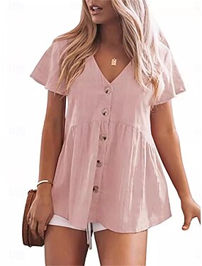 Per donna Camicia Cotone Arricciato Patchwork Bottoni Semplice Elegante Vacanza Manica Corta Scollo a V Top Regolari Quotidiano Spiaggia Ferie Nero Verde chiaro Rosa Rosso Viola chiaro Estate