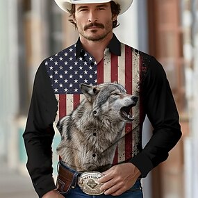 Per uomo Animale Lupo Bandiera Americana Camicia Camicia Western Camicia con Bottoni Manica Lunga Vintage Retrò Ferie Casual Quotidiano Primavera Autunno Collo ripiegato Stampa 3D camicie con colletto