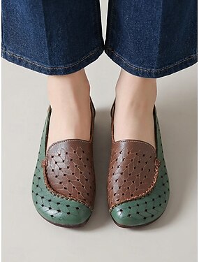 Scarpe slip-on da donna color kaki traforate a blocchi di colore: ballerine traspiranti dal design vintage a pianta larga, ideali per l'uso quotidiano, i viaggi e il comfort casual.