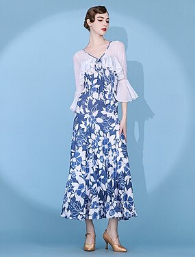 abito da ballo da sala floreale da donna con spalle scoperte, colletto a balze, abito da valzer a maniche lunghe, blu e bianco, abito da competizione moderno standard