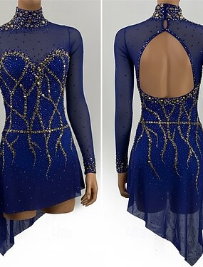 Abito da pattinaggio artistico Per donna Pattinaggio sul ghiaccio Vestito Blu Patchwork Schiena aperta Elasticizzato Allenamento Competizione Vestiti da pattinaggio sul ghiaccio Classico Cristallo