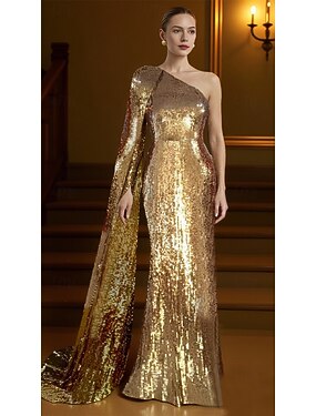 Tubino Colonna Lunghezza al pavimento Abito da ballo con mantello Abito da Sera Abito formale Elegante Brillanti Senza Maniche Monospalla Matrimonio Formale Con Paillettes con Glitter Paillettes