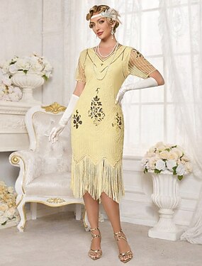 Anni Ruggenti Anni 1920 Lunghezza al ginocchio Vestito Nozze Addio al celibato Maniche corte Il grande Gatsby Charleston Invitato al matrimonio Paillettes Frangia con nappe Scollo a V Costume Per