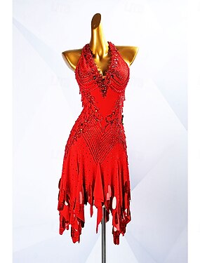 vestito da ballo salsa latino con frange e nappe, cristalli/strass, allenamento da donna, senza maniche, a pieghe alte
