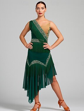 abito da ballo latino verde con cristalli di strass, frange metalliche e gonna asimmetrica per esibizioni di samba