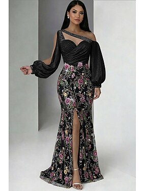 Sirena Tromba Lunghezza al pavimento Perline ricamate Abito Formale Abito da madre della sposa Abiti da Ballo Abito da Sera Abito formale Elegante Scintillante Stile Celebrità Manica Lunga Monospalla