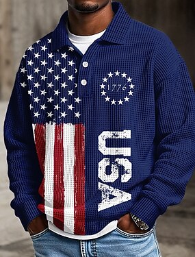 4 luglio 2026 250° Per uomo Bandiera Americana Polo Testurizzato Manica Lunga Magliette polo Bavero Casual Athleisure Abbigliamento quotidiano Stampa 3D Primavera Autunno Inverno Blu