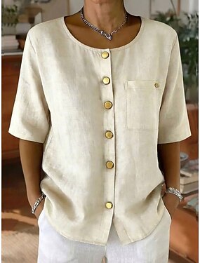 Per donna Camicia Estiva Blusa Tasca Bottoni Tinta unica Semplice Vacanza Vintage Manica Corta Girocollo Top corti Casuale Quotidiano Spiaggia Blu Giallo Rosa Beige Estate