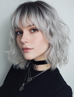parrucche corte argentate per donne, parrucca bob ondulata grigia sfumata con frangia, capelli sintetici di media lunghezza, parrucca con radici scure e onde d'acqua, parrucche grigie colorate